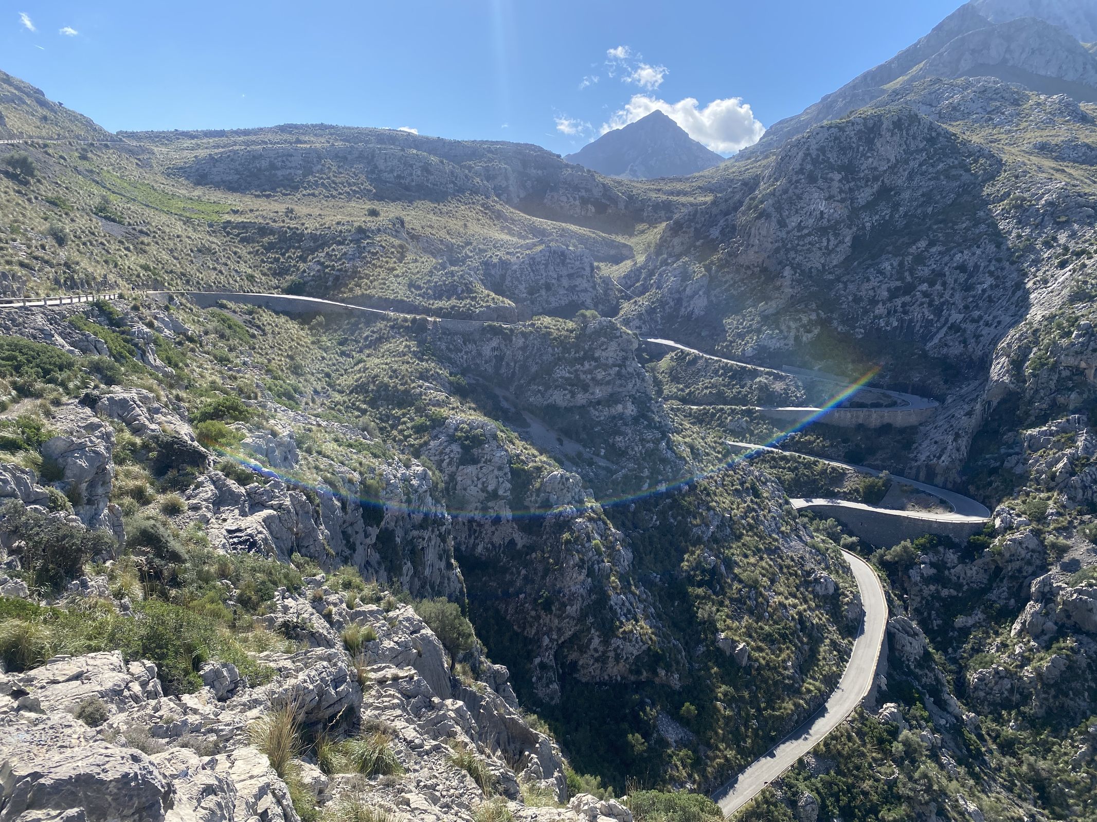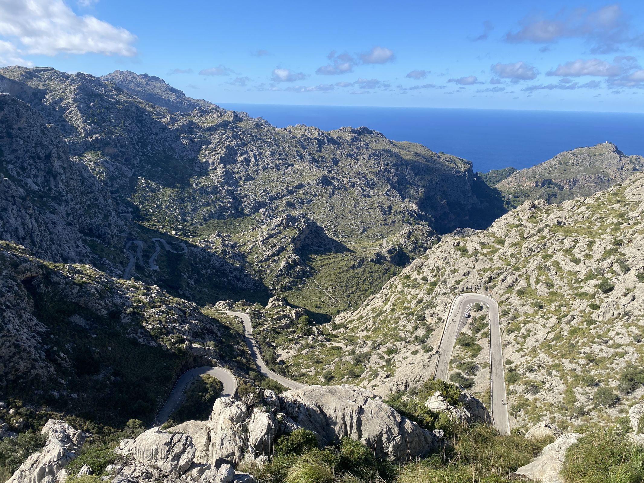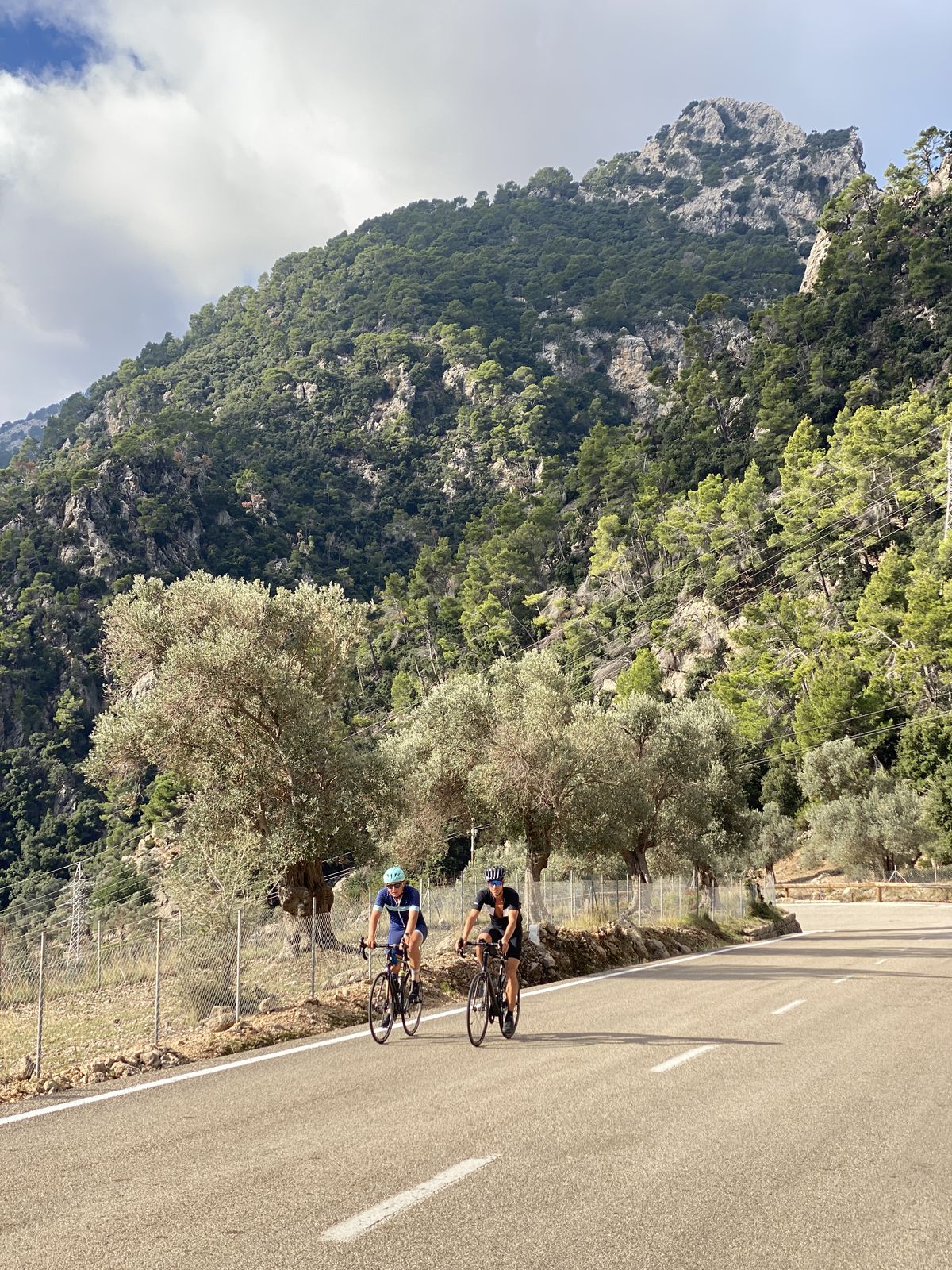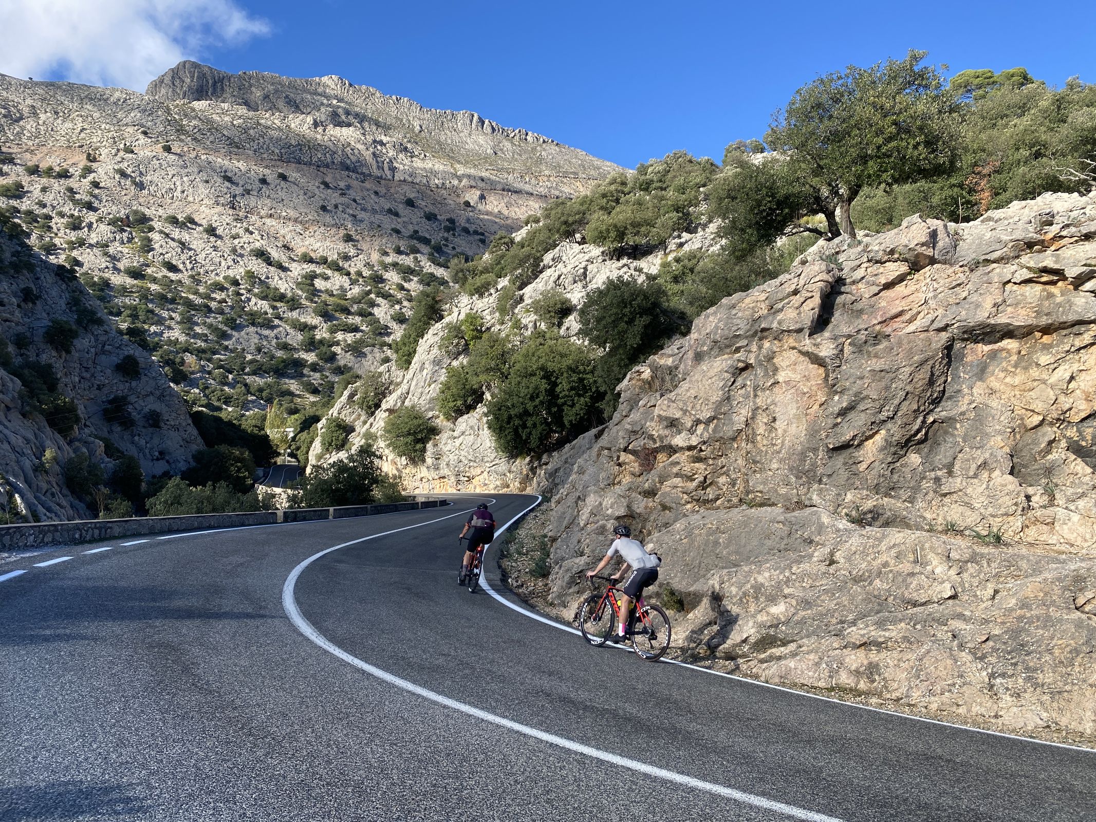 De laatste rit combineerde wederom aspecten van beide reizen. Wielrenners starten vaak met de beklimming van de Coll de Sóller. De eerste kilometers vanuit de haven zijn wat saai met verkeer, maar zodra het doorgaande verkeer de tunnel inrijdt en jij het smalle weggetje inschiet, begint de echte klim. In zo’n 30 haarspeldbochten klim je door een prachtig bos omhoog. Omdat ik vroeg startte en er geen verkeer was, kwam ik zelfs een paar herten tegen; ik had het rijk alleen. Deze klim is bovendien ideaal voor warme dagen omdat hij grotendeels in de schaduw ligt en je de zon pas later op de ochtend ziet.