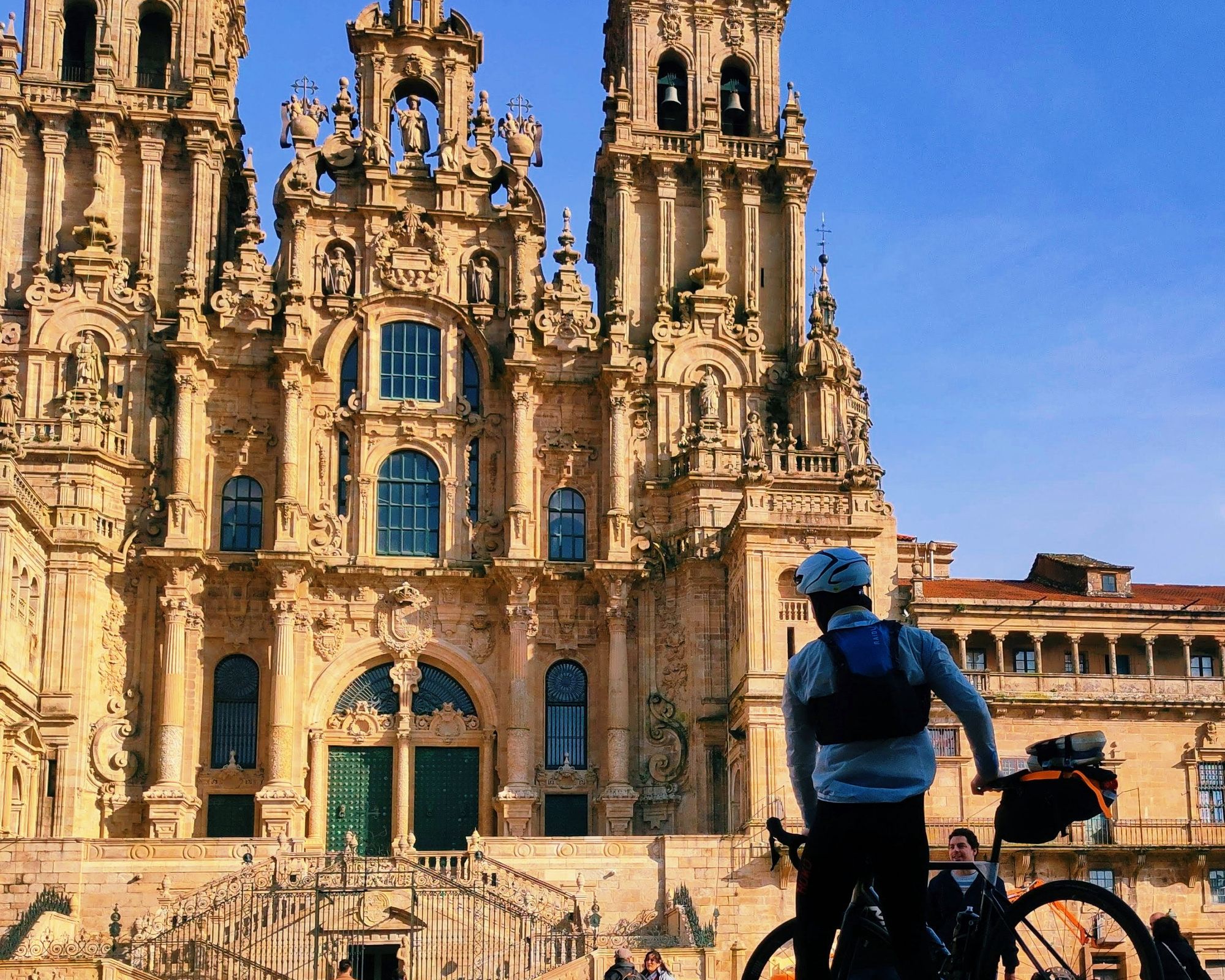 De laatste fietsdag begint tussen de eucalyptusbomen. Het is een aaneenschakeling van kleine stijgingen en afdalingen, met steeds meer pelgrims om je heen. Via dorpen als O Pedrouzo en Lavacolla rijd je naar Monte do Gozo, “de berg van de vreugde”, waar je de torens van de kathedraal voor het eerst ziet. Daarna rol je de stad in en sta je plots op het Praza do Obradoiro, tussen andere pelgrims die hun bestemming hebben bereikt. De rest van de dag is voor de kathedraal, de oude stad en misschien het ophalen van je Compostela.