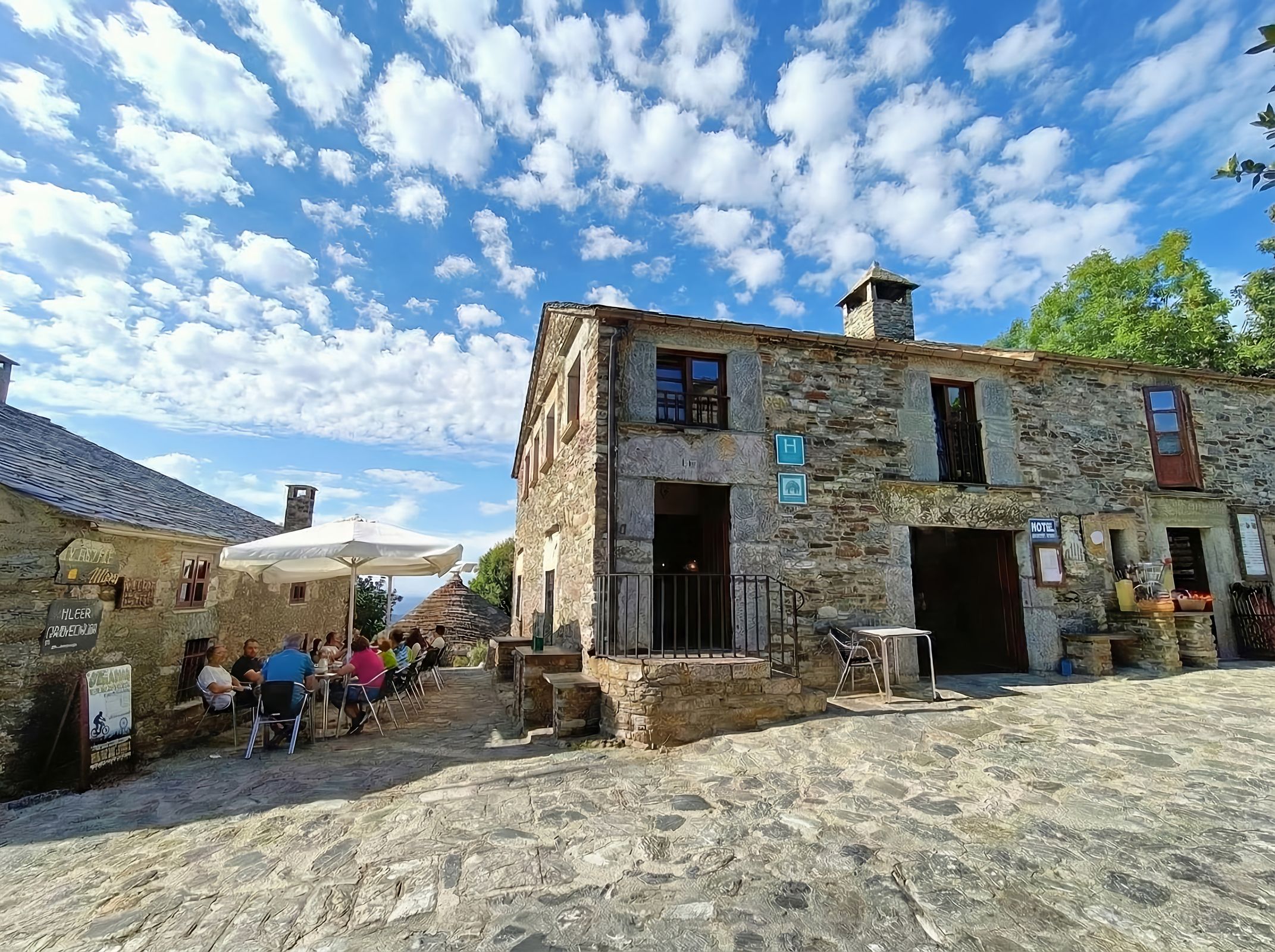 De dag begint rustig, door de vruchtbare vallei van El Bierzo, bekend om zijn wijnen en kastanjebossen. Je passeert Villafranca del Bierzo, met zijn kerken en rivierstrand, en draait dan het dal van de Valcarce in. De weg loopt nu gestaag omhoog, langs kleine dorpen en kastelen. De laatste klim naar O Cebreiro is serieuze kost, maar je wordt beloond met een dorp op een bergkam, met stenen huizen met rieten daken (pallozas) en een oude kerk die verbonden is met een Eucharistisch wonder. Hier steek je de grens met Galicië over.
