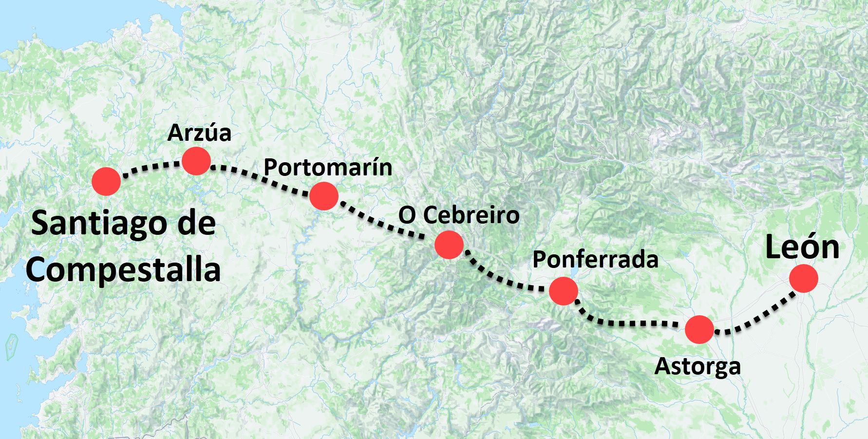 De Camino de Santiago die je hier fietst, is het laatste deel van de Camino Francés: de klassieke route van Léon naar Santiago de Compostela. Je volgt het spoor van miljoenen pelgrims, maar dan in je eigen tempo, op de fiets. Onderweg verandert het landschap voortdurend: van groene berghellingen naar de open hoogvlakte van de Meseta en uiteindelijk de heuvels en bossen van Galicië.