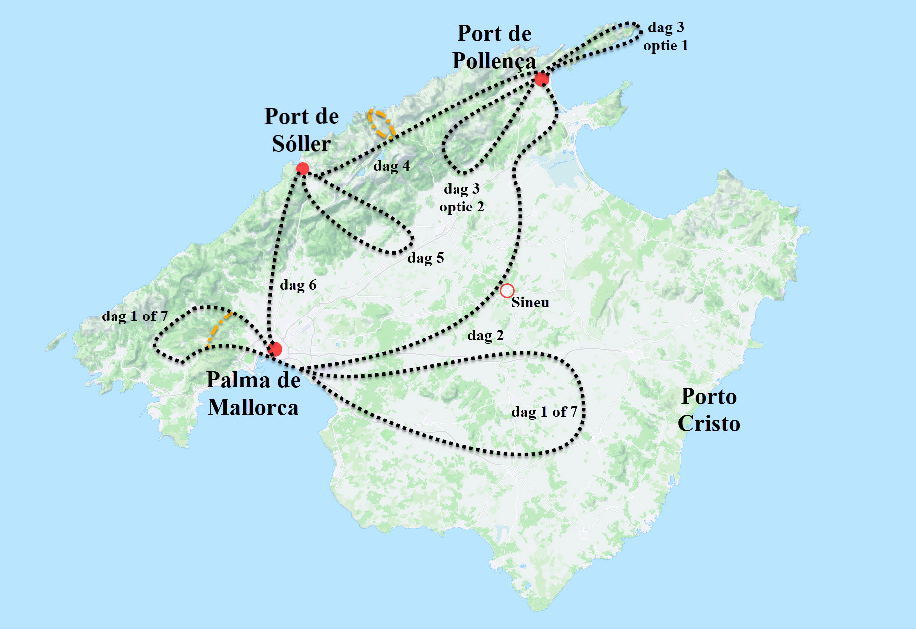 De route start in Port de Pollenca en voert via Pollenca naar de Coll de Femenia, een prachtige klim met vergezichten. Daarna fiets je glooiend richting het klooster van Lluc en de iconische afslag naar Sa Calobra. Sa Calobra is optioneel mee te pakken. Vanaf Sa Calobra klim je naar de top van de Puig Major. De rit eindigt met een heerlijke afdaling naar Port de Soller, omgeven door bergen en zee.